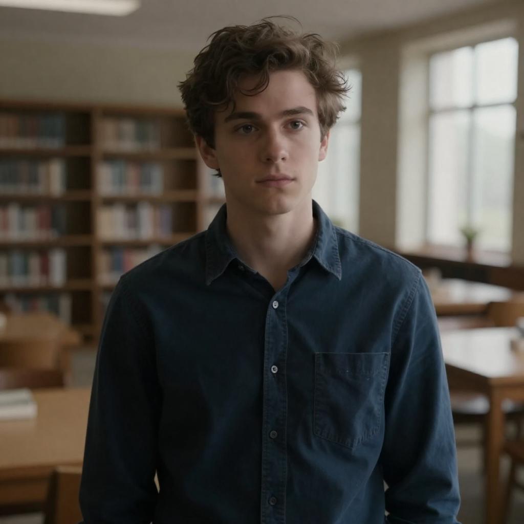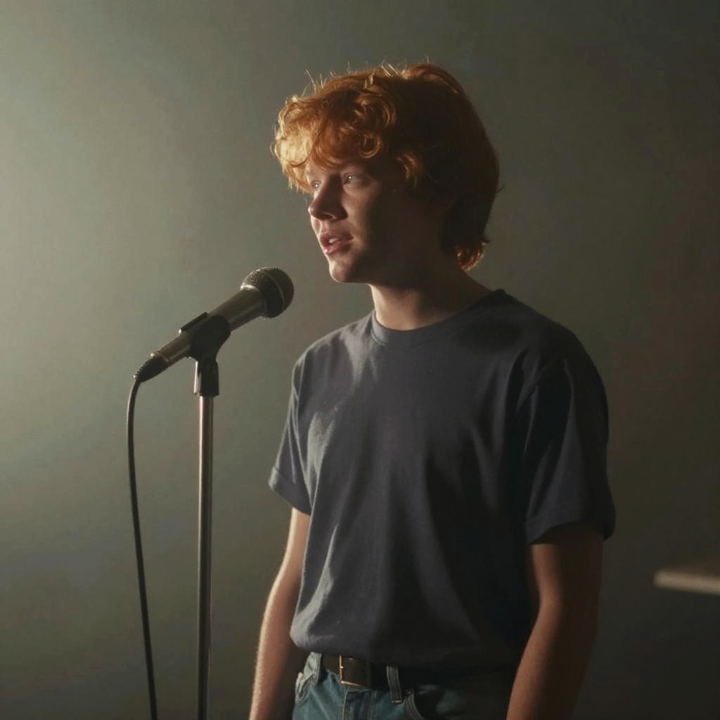 1boy redhead standing in front of a microphone, 80s advertising, haze-light-1800, cinematic lighting, shot on 16mm camera