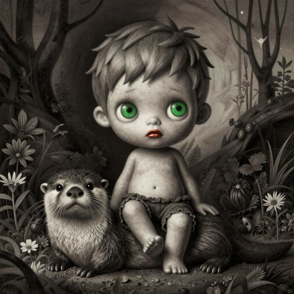 Black-and-white digital illustration of a curious, shirtless baby with blue eyes sitting beside a sleeping leopard in a dense, detailed jungle.