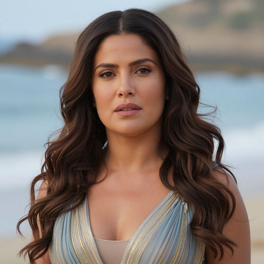 Salma Hayek Eternals Costume, a close up of a woman in a dress on a beach