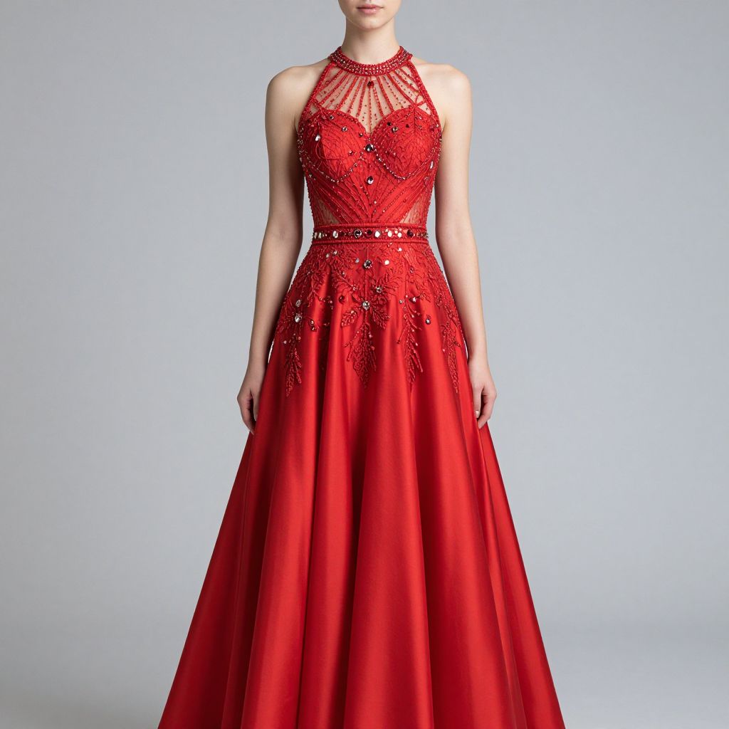 Elegant woman showcasing a vibrant red prom dress featuring high-neck embellishments with intricate beadwork, sequins, and crystal appliqués, paired with a sheer lace waistband and flowing A-line silhouette, exuding sophistication and grace.