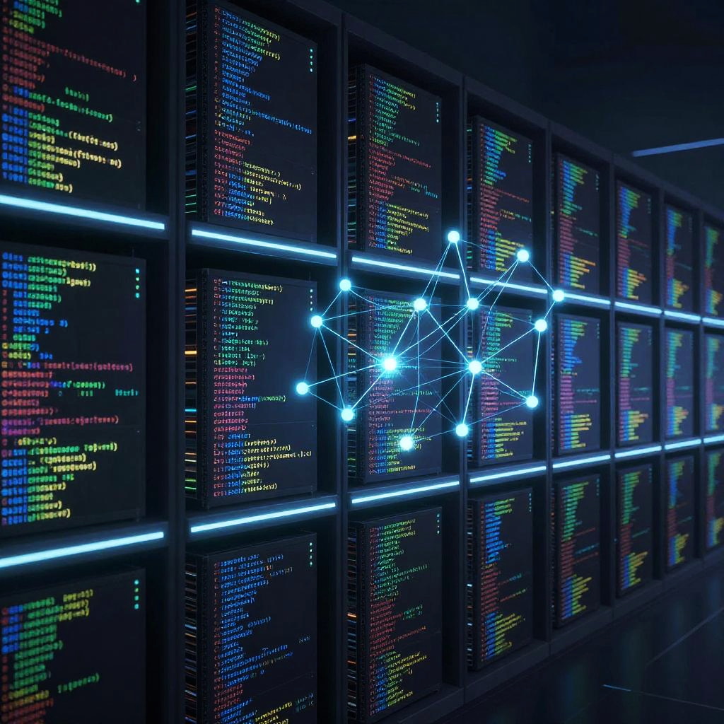 Repo visualization showing a vast virtual code repository, endless shelves of glowing data blocks and algorithmic sequences, bright neon lights with a dark background, complex network nodes connected by luminous lines, inspired by cyberpunk and sci-fi art