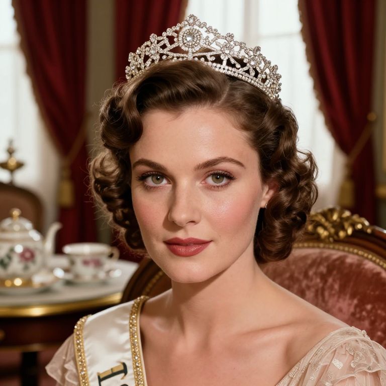 Photograph of a fair-skinned woman with short, curly brown hair, wearing a sparkling silver tiara and a white, lace-trimmed dress with gold accents. She has light blue eyes, arched eyebrows, and wears dark red lipstick. The background features rich, red velvet curtains and a blurred, ornate table with white and pink floral china. Her expression is calm and composed, exuding a classic, regal elegance reminiscent of vintage Hollywood royalty. The lighting is soft, highlighting her delicate features and the intricate details of her attire.