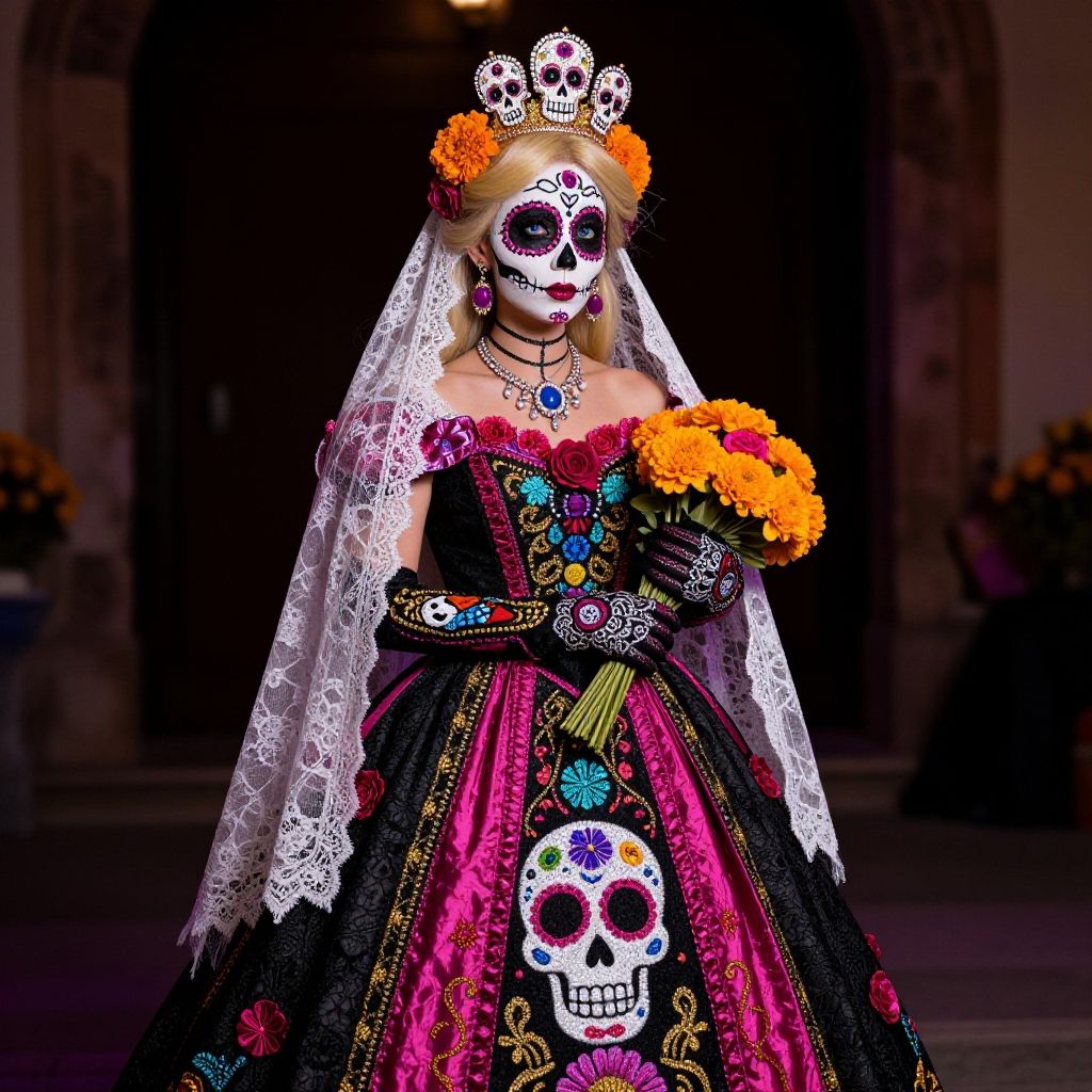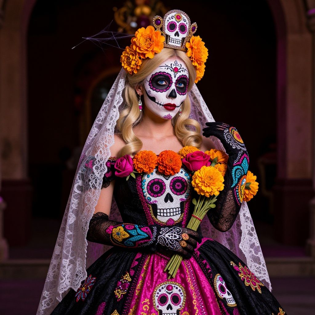 Princess Peach the beloved monarch of the Mushroom Kingdom has embraced the vibrant and captivating allure of the DayOfTheDead festival, In a departure from her usual regal attire she radiates an enchanting blend of tradition and fantasy in her DayOfTheDead-themed ensemble, resplendent skull-inspired gown adorned with sugar skull patterns, The vibrant hues of magenta turquoise and gold stand out against the traditional black base creating a mesmerizing contrast, A delicate lace mantle drapes gracefully over her signature long blonde locks adorned with meticulously crafted paper marigolds and delicate spiderwebs, A regal royal crown redesigned with sugar skull embellishments sits atop her head, Intricate black and white patterns accentuate her eyes, her lips are painted in a deep velvety red reminiscent of blood-red roses, Peach radiates beauty and strength embodying the duality of life and death with every brushstroke, elegantly embroidered gloves that reach just above her elbows featuring intricate lace details and vibrant patterns that harmonize with the rest of her attire, carries a bouquet of marigolds and roses, blue eyes, detailed eyes, narrow waist, perfect skin, 1girl, high res, best quality, cinematic lighting, dimly lit Mexican dark background, blur background, suggestive head tilt, black and pink dress