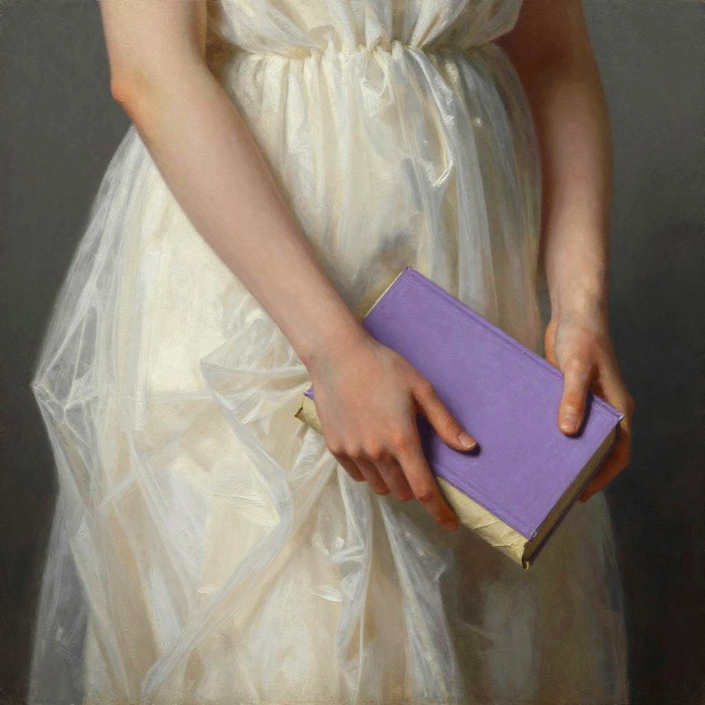 A close-up painting of a person's hands holding a purple book wrapped in beige paper. The person is wearing a flowing, white, classical-style dress with soft, delicate folds. The hands are gently gripping the book, with fingers slightly curled. The background is a dark, muted gray, making the hands and book the focal point. The style is realistic with a slight impressionistic touch.