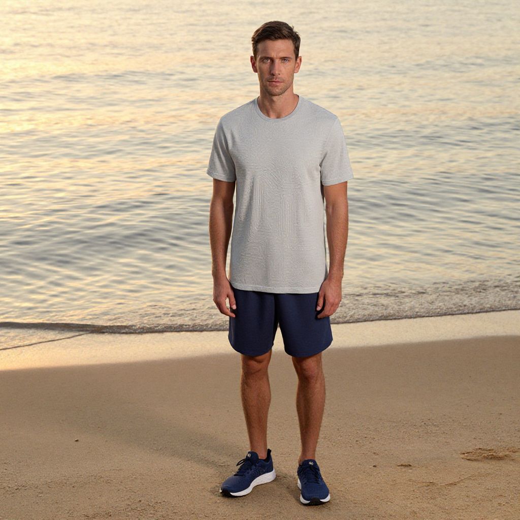 Photograph of a fit, Caucasian man with short brown hair, wearing a light gray t-shirt, navy shorts, and blue sneakers, standing on a