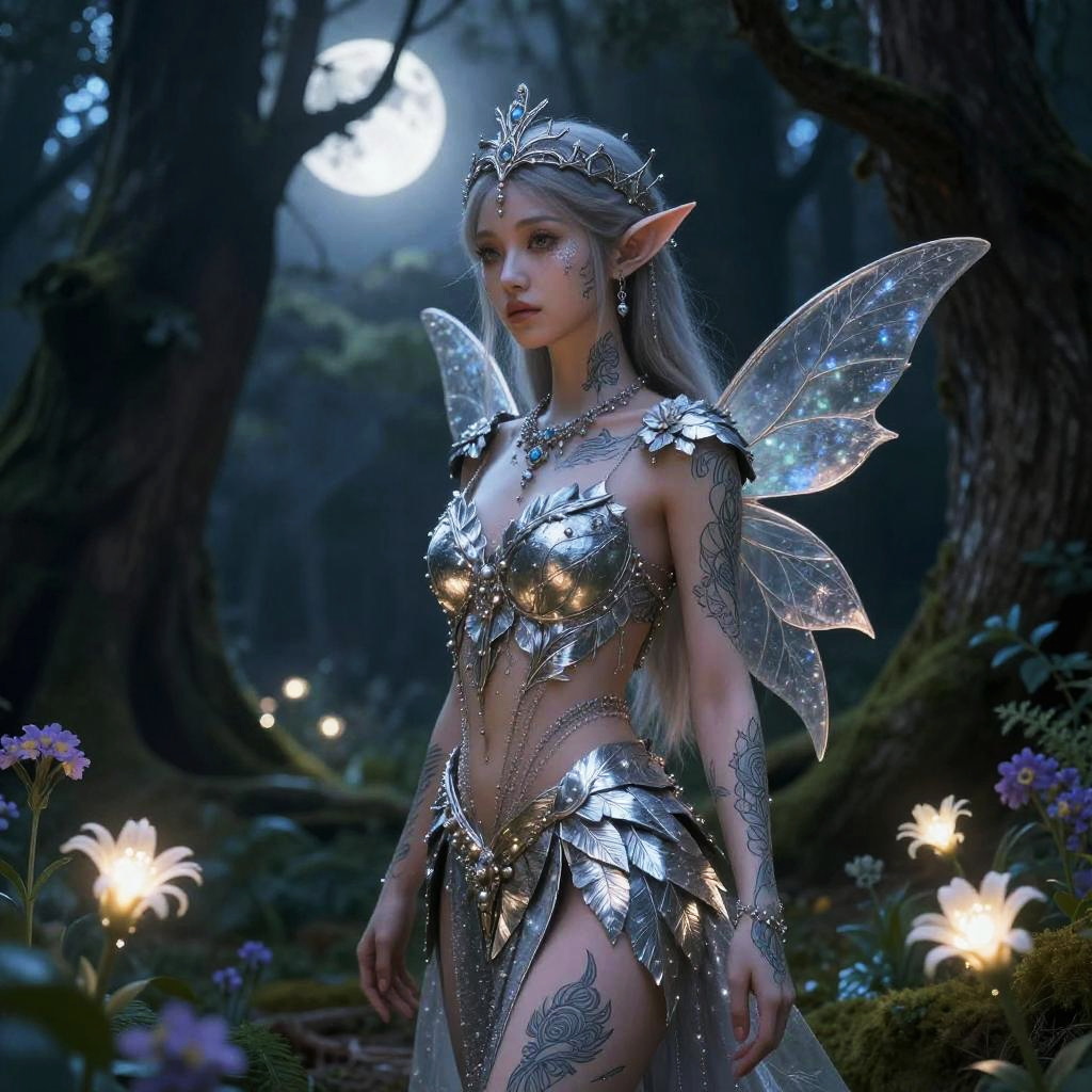 Digital artwork of a fantasy elf woman standing in a moonlit forest. She has long, silver hair, pointed ears, and wears a silver tiara. Her outfit is made of shimmering, metallic armor pieces that cover her breasts and hips, leaving her midsection and legs exposed. She has transparent, butterfly-like wings with a sparkling texture. Her skin is pale and adorned with intricate, silver tattoos. The background features dark, towering trees and glowing, ethereal flowers. The moon is partially visible through the trees, casting a mystical light over the scene. The overall style is highly detailed and realistic, with a magical, otherworldly atmosphere.