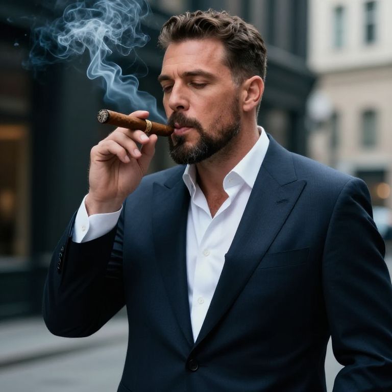 Photograph of a handsome, bearded man with short, dark brown hair, wearing a black suit and white dress shirt. He is smoking a thick, Cuban-style cigar, with wisps of blue-gray smoke curling around his face. His eyes are closed, and he has a calm, confident expression. The background is an urban street with blurred, dark and light buildings, suggesting a city setting. The image has a sharp focus on the man, with a shallow depth of field that blurs the background. The overall mood is sophisticated and relaxed.