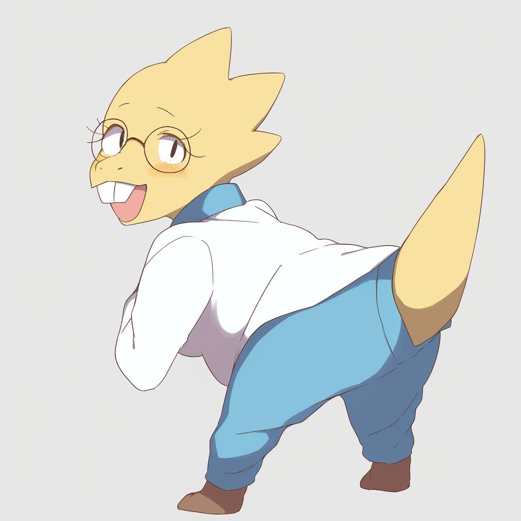 Digital illustration of Alphys, a character from Undertale, depicted as a yellow anthropomorphic reptilian with glasses, wearing a white top and blue pants. The character is shown from a rear three-quarter view, highlighting the tail and casual clothing.