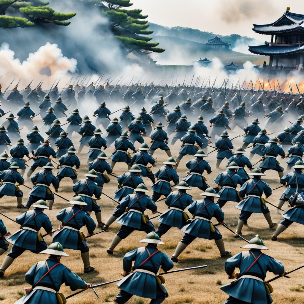 Stamping Create a powerful and realistic image of a large group of Japanese soldiers from the Sengoku period charging into battle against a group of ancient Korean soldiers. The scene should depict the intensity of the moment, with the soldiers engaged in close combat and wielding various weapons such as swords, spears, and bows. The Japanese soldiers should be dressed in traditional armor and clothing, and the Korean soldiers should be wearing their own distinct uniforms and gear. The background should be a battlefield filled with smoke, debris, and other signs of a violent clash. The overall image should convey the chaos and drama of this historical conflict,