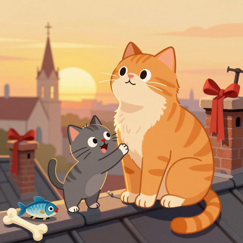 Digital illustration of a brown and white dog sitting on a cobblestone street, embracing a gray and black tabby cat. The dog has a slightly sad expression, while the cat looks content. Both wear collars. Background includes a narrow alley with sunlight, green ivy, and a distant car.