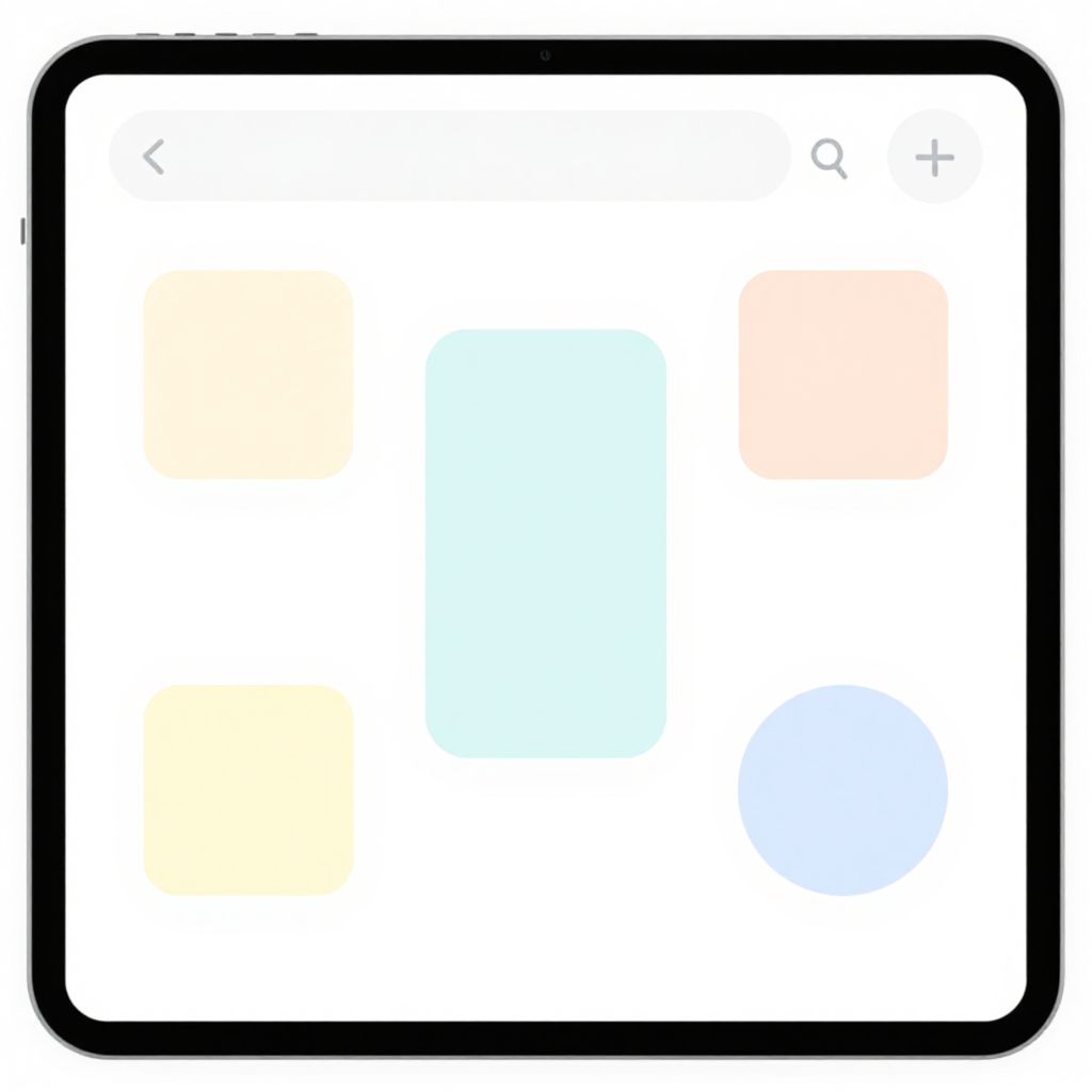 Minimalist clip art generator screen with simple geometric shapes being combined, clean white background, pastel color palette, flat design style emphasizing clarity and ease of use, softly rounded interface buttons and menus