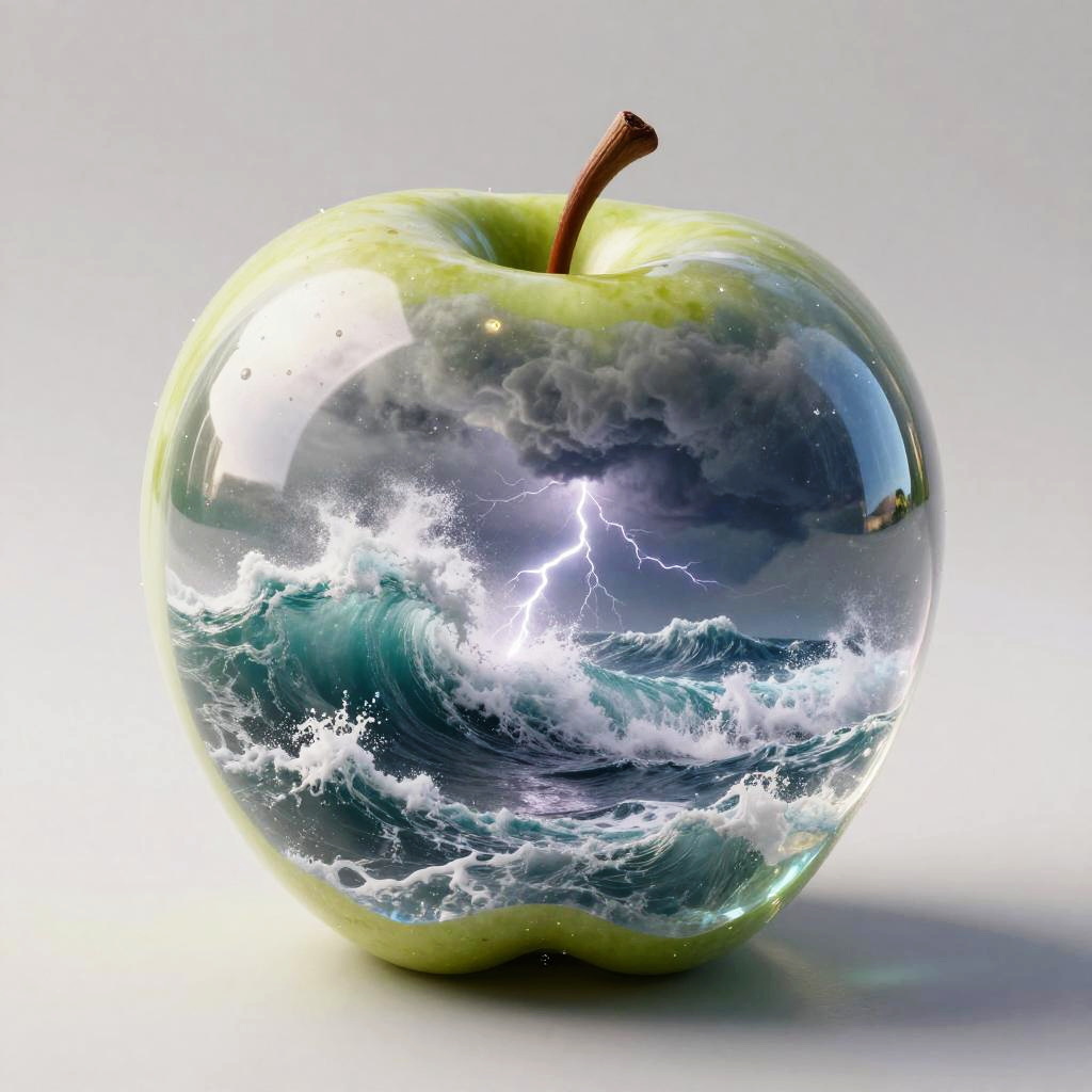 Imagine a photograph capturing an extraordinary and surreal subject: a transparent apple, crystal clear and perfectly formed, revealing a highly detailed, tumultuous miniature sea raging within. The apple sits boldly in the center of the frame, its smooth, glass-like surface reflecting light and offering a window into the dynamic scene inside. Within, the stormy sea is a marvel of miniaturization - tiny waves crest and crash with realistic ferocity, and if one looks closely, minute flashes of lightning and swirls of wind can be discerned, adding to the tempest's drama. The background of the photo is intentionally simple, perhaps a soft, neutral color or a subtle gradient, ensuring that all attention is drawn to the striking contrast between the serene exterior of the apple and the wild, chaotic seascape it contains. The lighting is key, illuminating the apple in a way that highlights the intricate details of the storm inside while maintaining the overall clarity and impact of the image.
