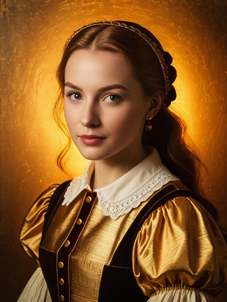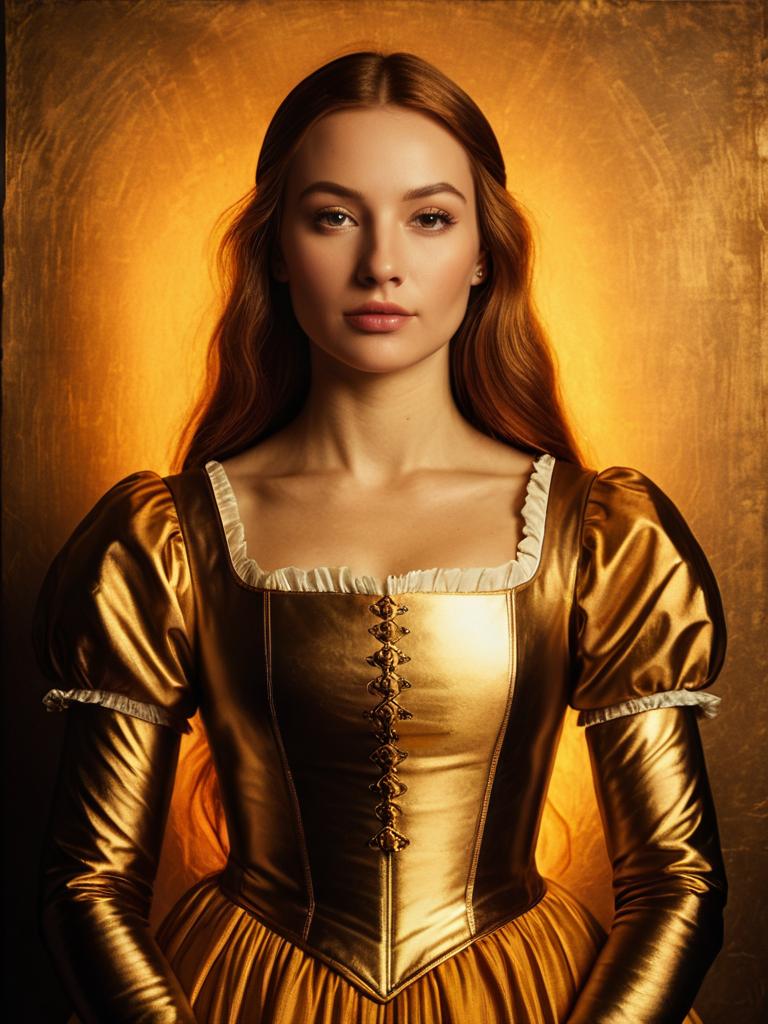 Portrait of a young woman wearing a shiny golden Renaissance-style dress with puffed sleeves and intricate details, posing against a warm textured golden background. She has long wavy red hair and a calm, neutral expression.