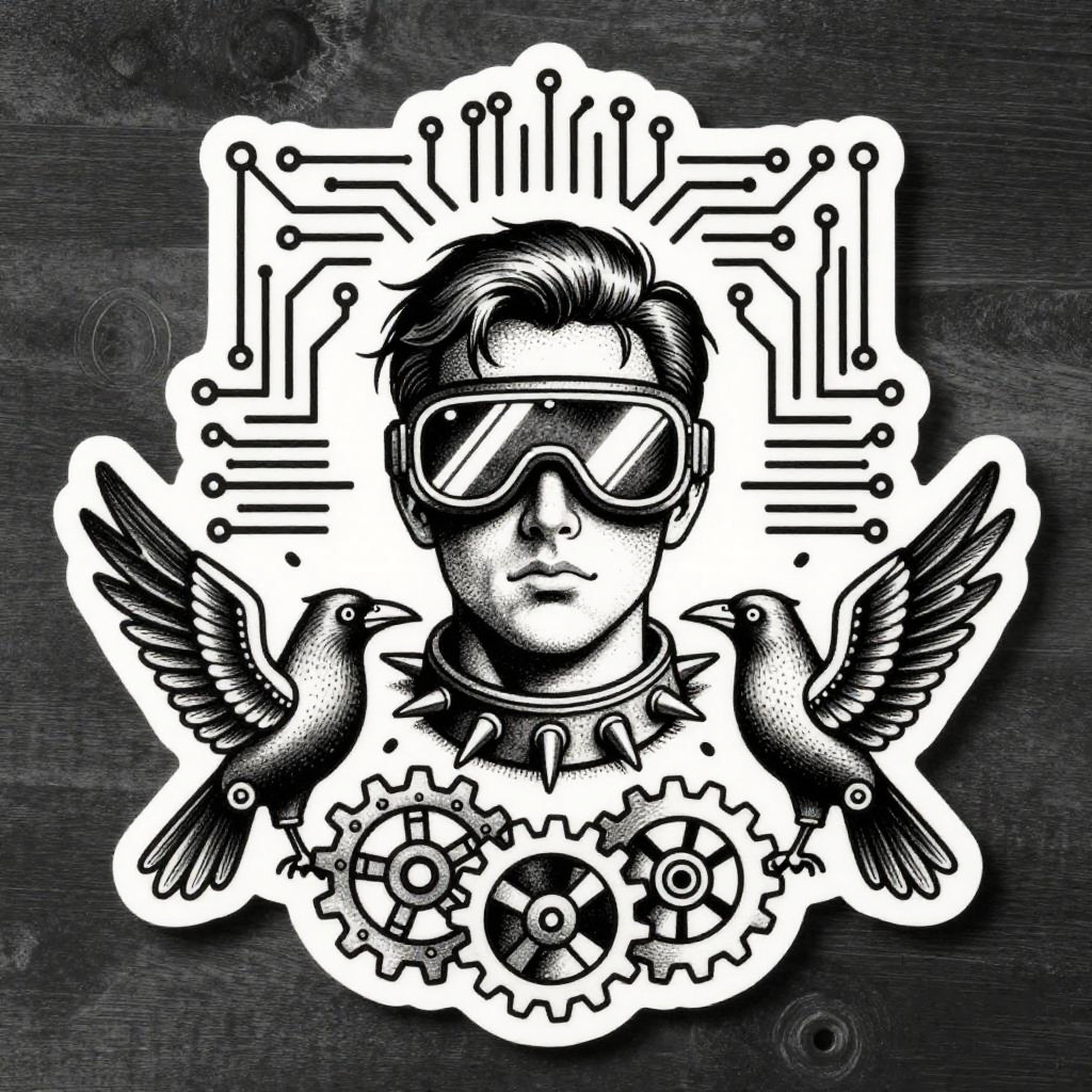 Monochrome ink illustration in a vintage tattoo flash aesthetic featuring man with cyberpunk goggles and spiked collar, framed by circuit board patterns above, mechanical crows flanking, and cogwheels below. Printed on dark brushed metal, with crisp linework, stippling and crosshatching, bold negative space, subtle vignette, museum-print finish, high contrast, fine detail, gritty yet elegant mood.