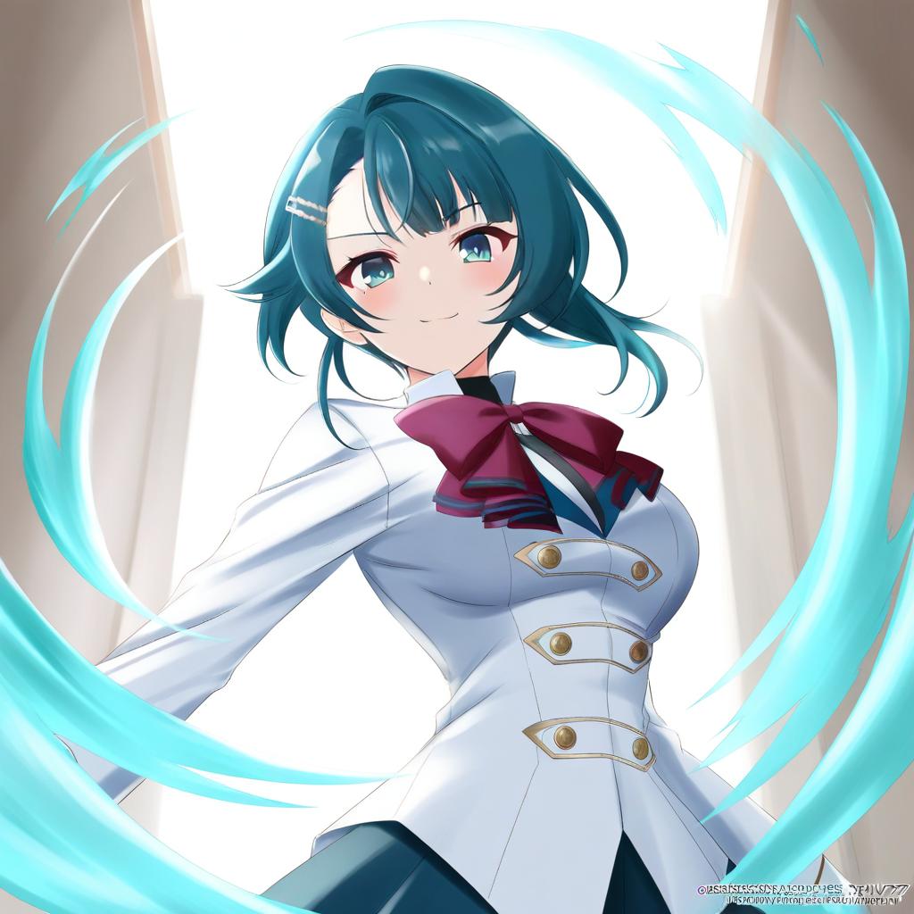 Aizawa kazuha, assault lily, 1girl, blue eyes, blue hair, asymmetrical hair, short hair, medium hair, blunt bangs, hairclip, medium breasts, herensuge girls academy school uniform, school uniform, long sleeves, red bowtie, by artist kuroi mimei, illustrious