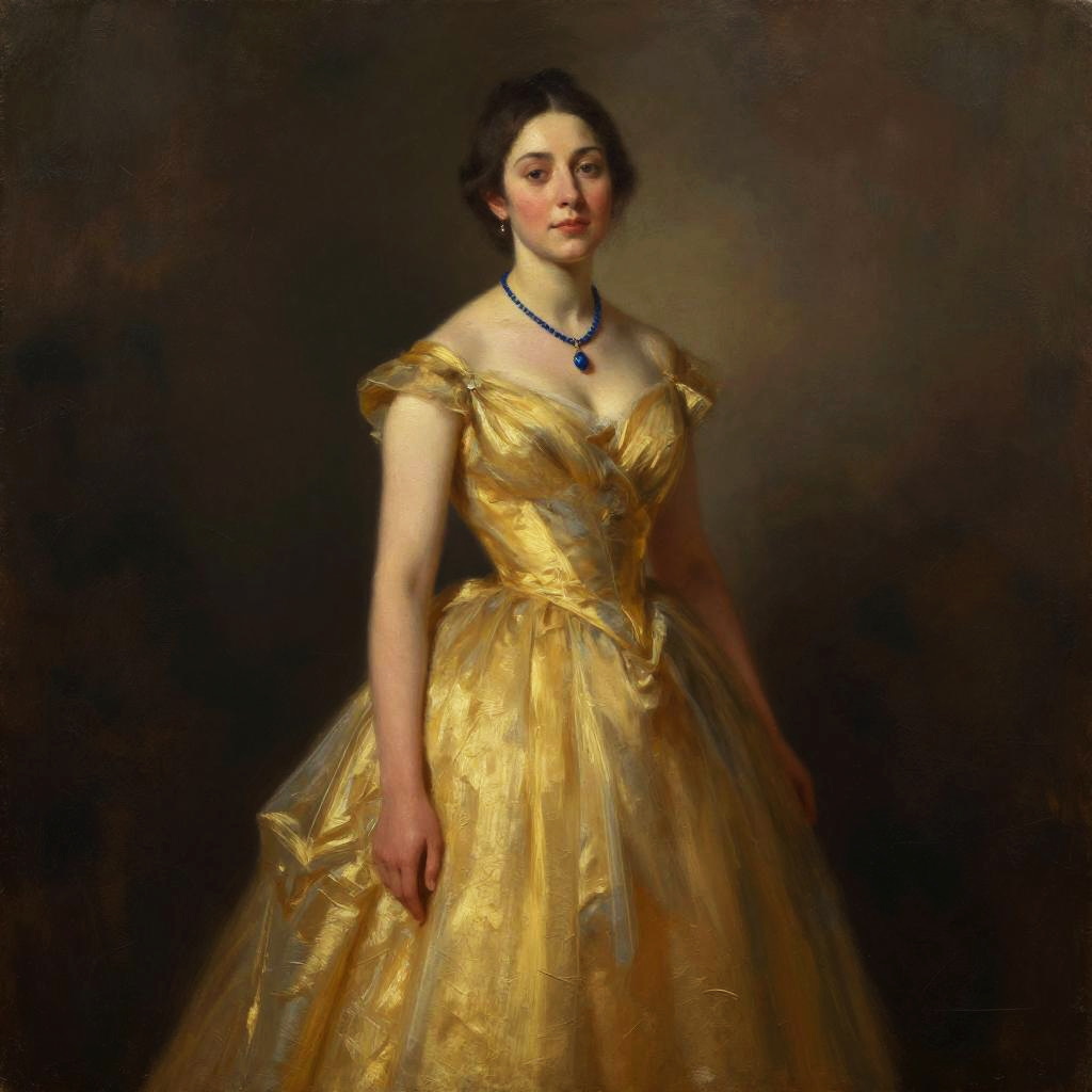 Skirt Formal, woman in a gold dress with a necklace and a blue necklace --sref 1405