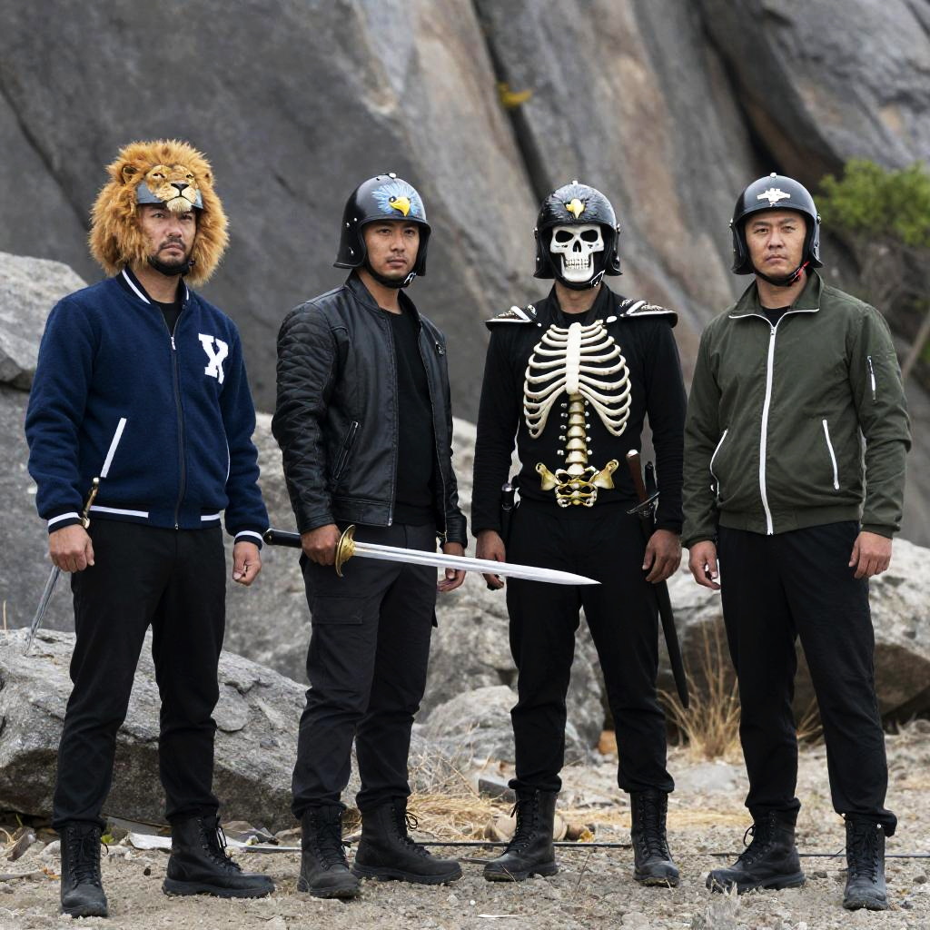 Photograph of four men in a rocky landscape. Three men wear helmets with different designs (one with a lion face, one with an eagle face, and one with skeletal ribs) and hold swords. The fourth man in a blue jacket with white lettering and black pants stands to the left. The man in a green jacket with white zippers and black pants stands to the right. All men have intense expressions. Rocky background with sparse greenery.