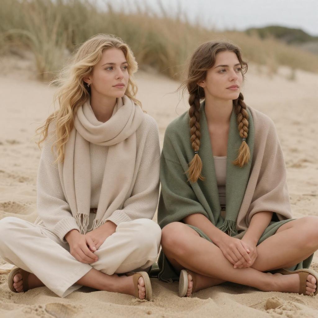 Two women sitting on a sandy beach, both with wavy, blonde hair. The woman on the left wears a beige scarf and sweater, the woman on the right has braided hair, wears a green and beige shawl. Both look to the right. Background includes dry grass and blurred vegetation. Sand ures visible.