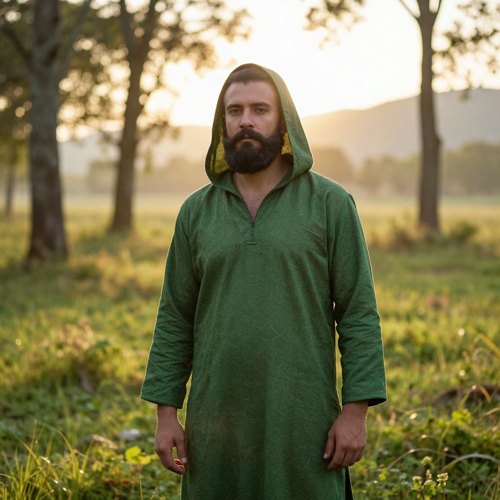 A man with a full beard and a well-groomed mustache is wearing a stylish green outfit with a hood, standing in a vibrant forest clearing under a soft golden sunset. The green clothing features subtle patterns and has a slightly rugged, weathered look, suggesting it's been worn for some time. His eyes are focused forward, exuding a calm and thoughtful expression, with a faint glow of warmth in the setting sun casting long shadows around him. The background shows misty trees and a distant mountain range, adding depth and atmosphere to the scene.
