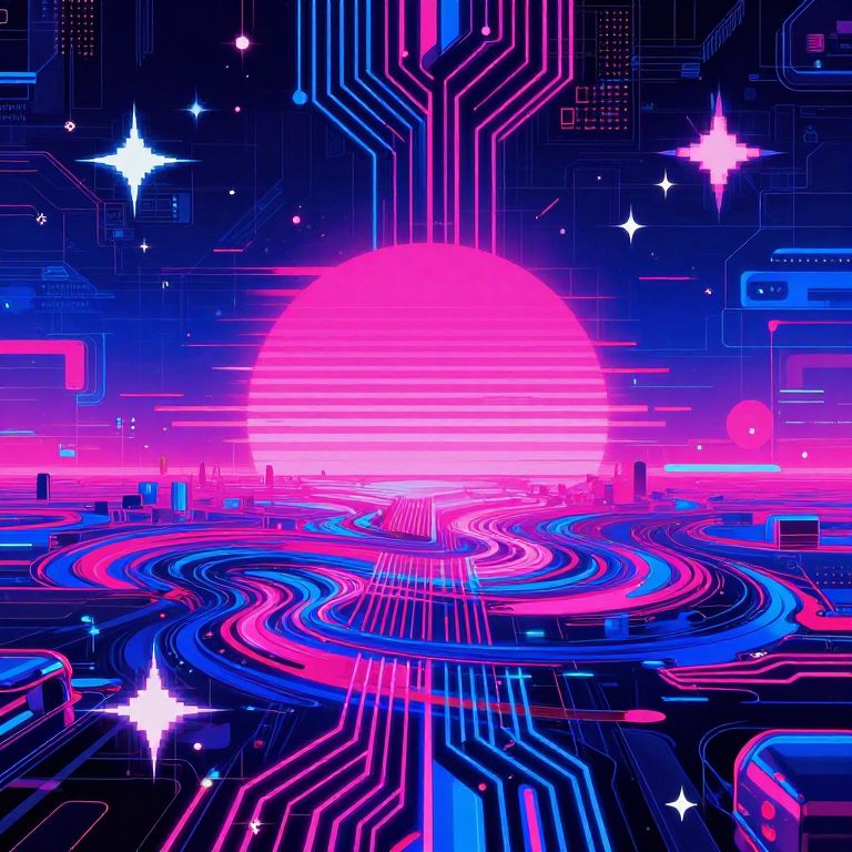 Neon digital artwork: vibrant pink and blue circuitry paths winding towards a glowing pink sun, surrounded by stars and electronic lines.