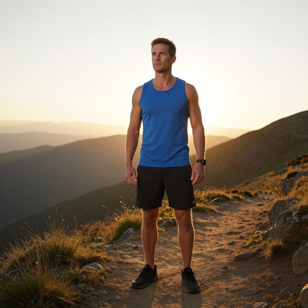 Photograph of a muscular, white, middle-aged man standing on a mountain trail at sunset. He wears a blue sleeveless tank top, black athletic shorts, and black running shoes. His short brown hair is slightly windswept. He has a black wristwatch on his left wrist and stands with a confident, relaxed posture. The background features a panoramic view of rolling mountain ranges, with the sun casting a warm, golden glow across the landscape. The trail is rugged, with patches of grass and rocks on either side. The sky is clear, transitioning from orange near the horizon to blue higher up.