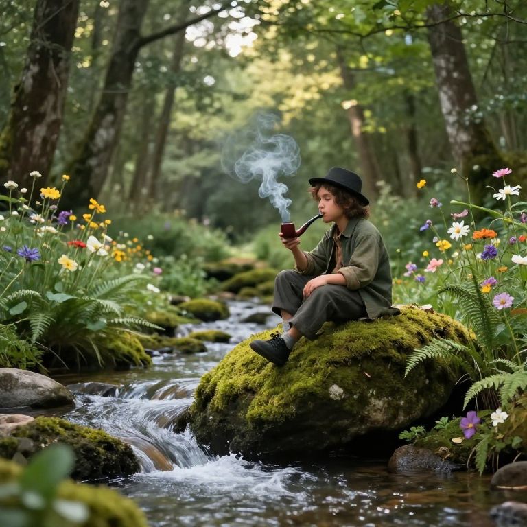 Photograph of a young man with curly hair, wearing a green shirt, brown pants, black boots, and a black hat, sitting on a moss-covered rock in a forest. He smokes a pipe, with blue-gray smoke curling upwards. The forest is lush with green ferns, colorful wildflowers, and tall trees. He sits beside a small, clear stream with white-capped rocks and flowing water. Sunlight filters through the trees, creating a dappled light effect. The scene is serene and picturesque, with a mix of natural textures and vibrant colors.