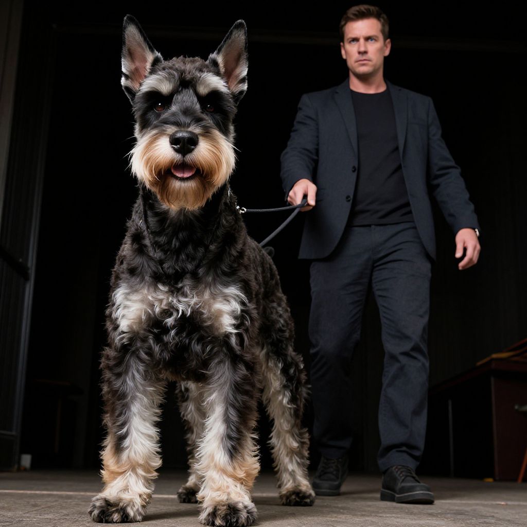 Intense, cinematic framing: low angle, ground level, capturing the dynamic duo's interaction. Majestic giant schnauzer stands tall, its piercing gaze commanding attention, while the man confidently strides alongside, hands gently guiding the leash. Dramatic lighting highlights their bond, emphasizing the dog's regal presence and the human's gentle authority. Rich Man has masculine face and piercing eyes