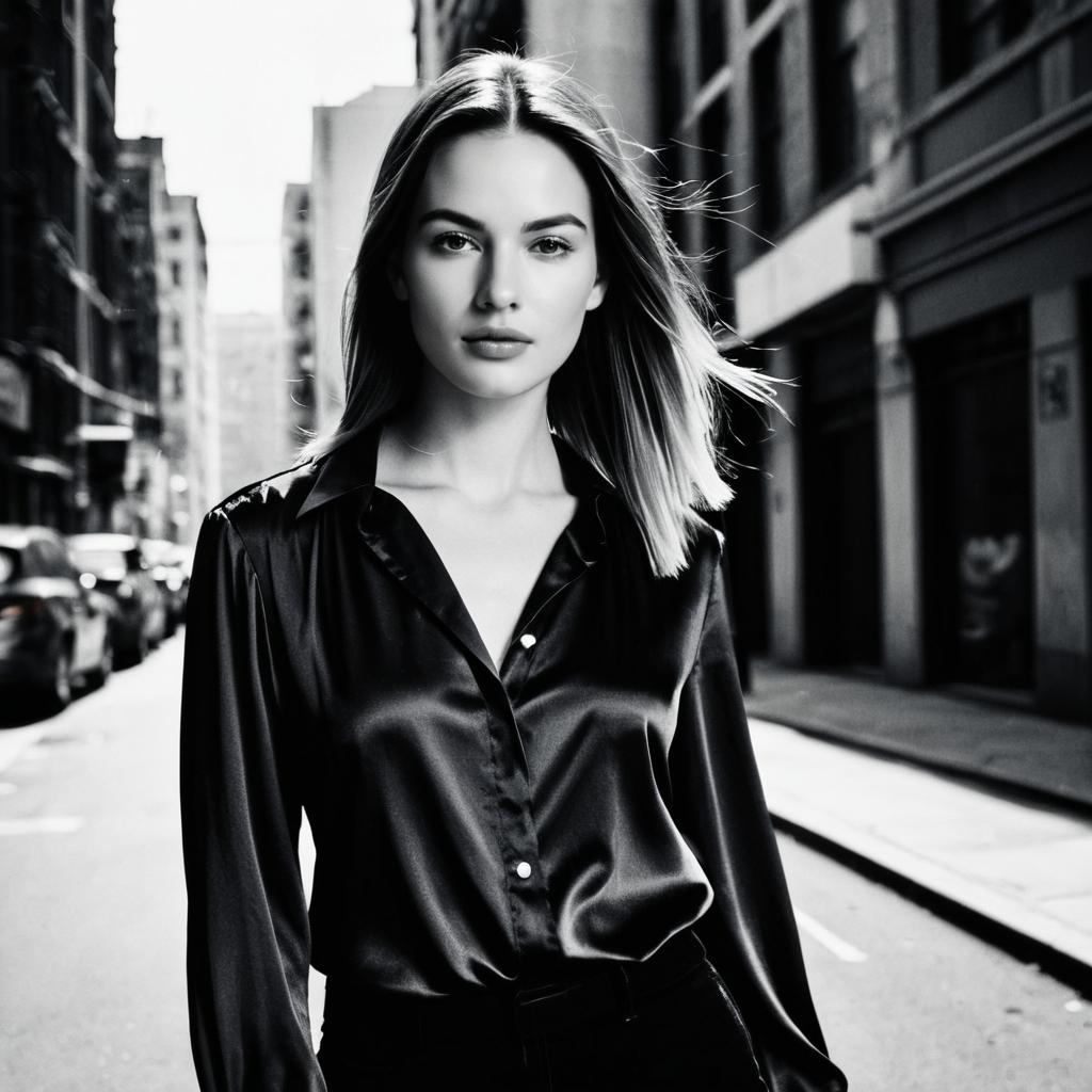 Shoulder-Length Straight hairstyle on fashion model, wearing silk blouse, in urban setting, captured in fashion editorial style with dramatic high contrast.