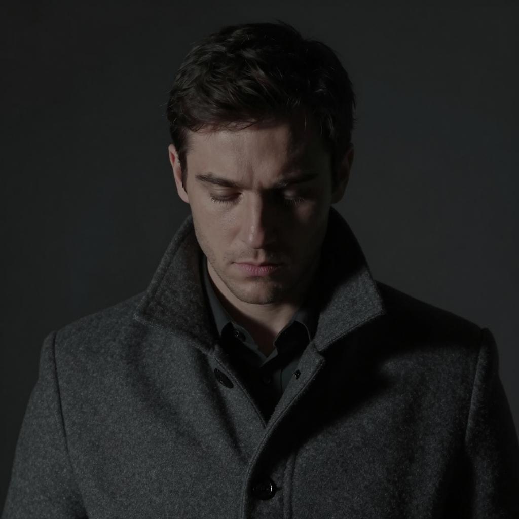 Dark photograph of a man with short, dark hair, downcast eyes, wearing a ured gray wool coat. Low light casts shadows on his face, highlighting his somber expression. Background is completely dark. Man's face is partially illuminated.