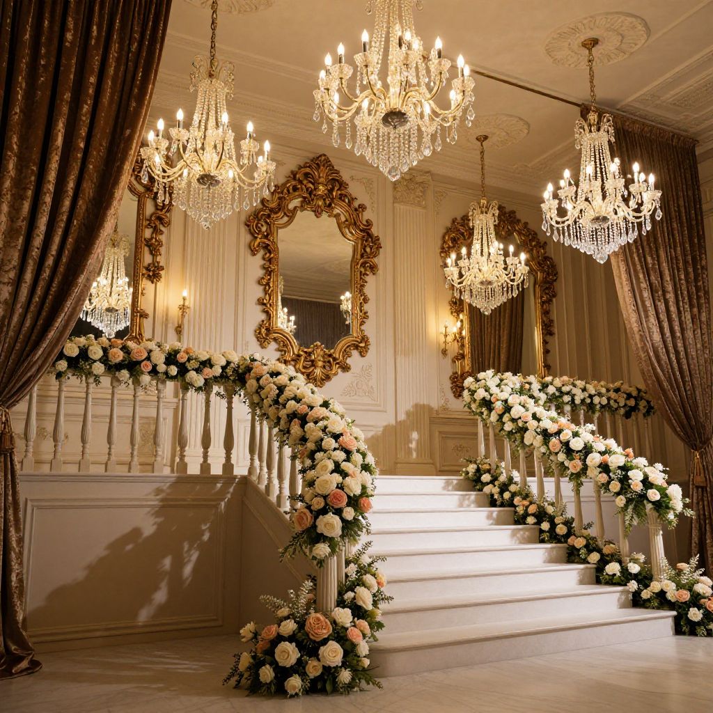 Photograph of an opulent, grand staircase in a luxurious hall adorned with three large, sparkling chandeliers. The staircase is flanked by rich, dark brown velvet curtains on either side. Ornate, gold-framed mirrors hang on the white, paneled walls. The staircase is decorated with lush, white and pink floral arrangements, cascading from the handrails and steps, creating a lavish, elegant atmosphere. The warm, golden light from the chandeliers enhances the luxurious feel, casting soft shadows and highlights. The overall style is classic and regal, evoking a sense of sophistication and grandeur.