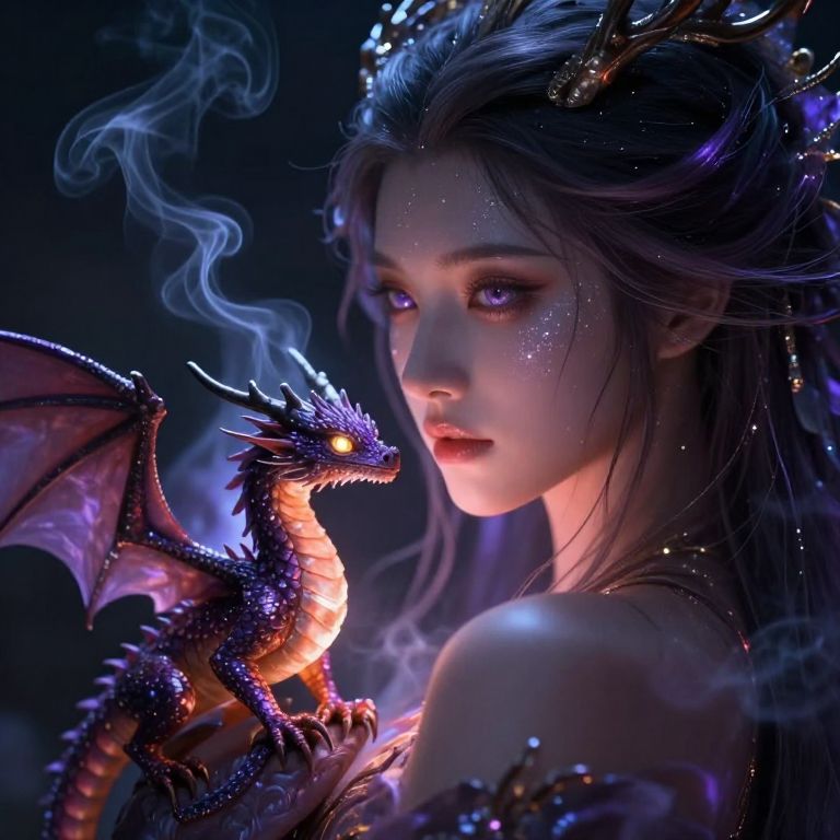 Create a mesmerizing close-up of a mythical creature with enchanting female features, focusing on her face and a small dragon perched on her shoulder, Her face is the epitome of otherworldly beauty, glowing with a soft, radiant light that illuminates the surrounding darkness, Her expression is serene yet powerful, with eyes that convey ancient wisdom and magic, Her flawless skin shimmers faintly, as if touched by stardust, and her flowing hair frames her face, gently swaying as if suspended in a dreamlike state, Perched on her shoulder, a small dragon is also in sharp focus, its delicate scales reflecting hues of purple and orange, perfectly complementing the swirling smoke that her wings stir in the background, The dragon's wings are slightly spread, with tiny tendrils of smoke rising from them, adding to the mystical atmosphere, Its bright, intelligent eyes meet hers, suggesting a deep connection between them, The intricate details of both the creature’s face and the dragon are meticulously crafted, highlighting their bond, The dark, shadowy background emphasizes the glowing, radiant beauty of the mythical pair