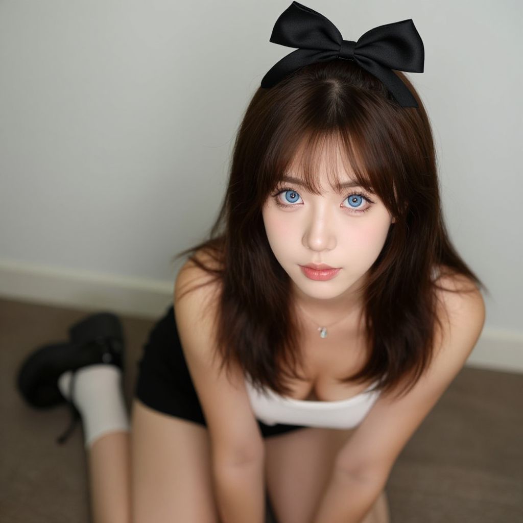 Photograph of a young woman with fair skin and long brown hair in a side braid adorned with a pink flower. She is sitting on a carpeted floor against a cream-colored wall with dark brown baseboards. She wears a white, strapless, pinstriped mini dress and light blue knee-high socks. Her expression is neutral, and she is positioned with her legs folded beneath her and her hands resting on the floor. The image has a slight digital enhancement, making the colors appear slightly over-saturated.