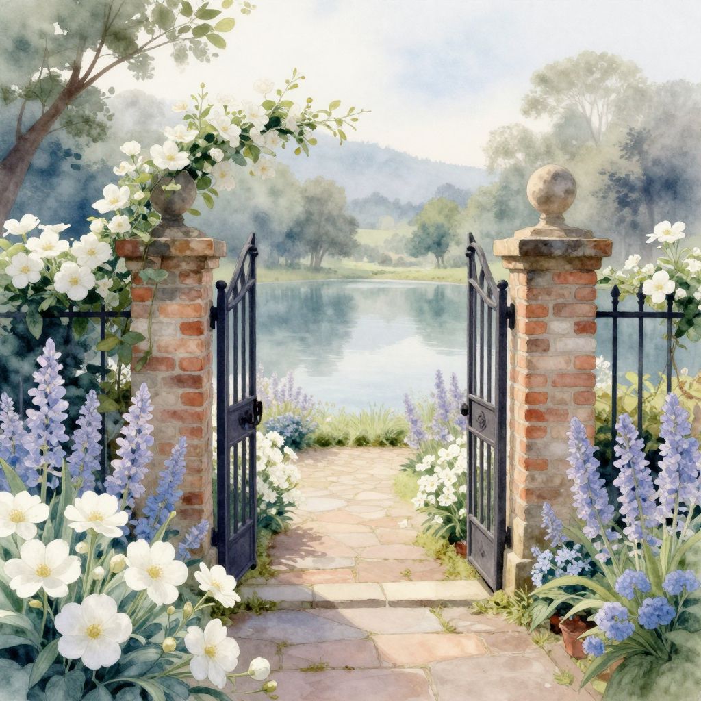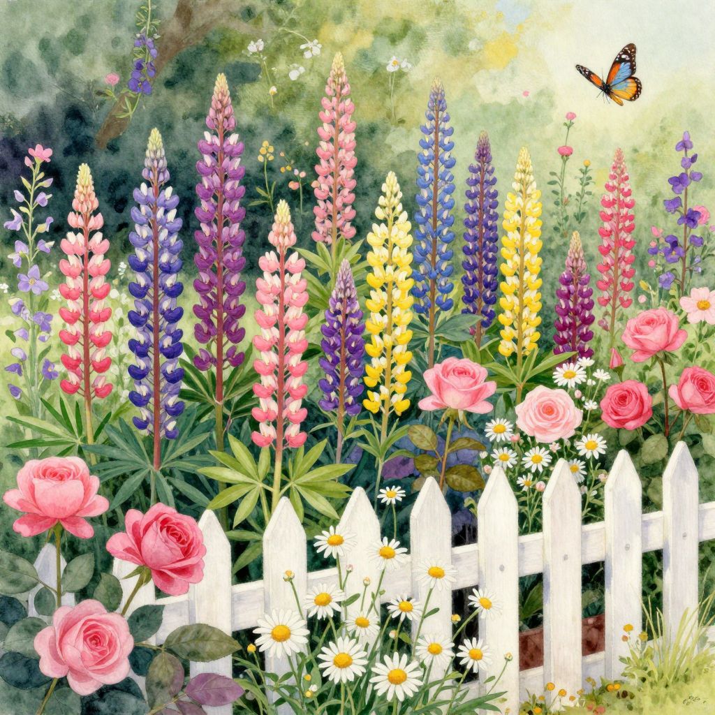 The image depicts a vibrant, watercolor painting of a country garden filled with a variety of flowers, including lupins, roses, daisies, and wallflowers. The garden is lush and colorful, with flowers in shades of pink, purple, yellow, and blue. The lupins, with their tall, slender stalks and bell-shaped flowers, are prominently featured, standing tall and proud. The roses, with their lush, rounded blooms, add a touch of elegance and romance to the scene. The daisies, with their dainty white petals and yellow centers, provide a delightful contrast to the more elaborate flowers. The wallflowers, with their clusters of small, tubular flowers, add texture and depth to the garden. The flowers are arranged in a natural, organic manner, with some in the foreground and others receding into the background, creating a sense of depth and perspective. The garden is enclosed by a white picket fence, which adds a quaint, rustic charm to the scene. A single butterfly flutters gracefully in the top right corner, adding a sense of movement and life to the painting. The overall composition is harmonious and balanced, with the flowers and fence creating a pleasing visual rhythm.
