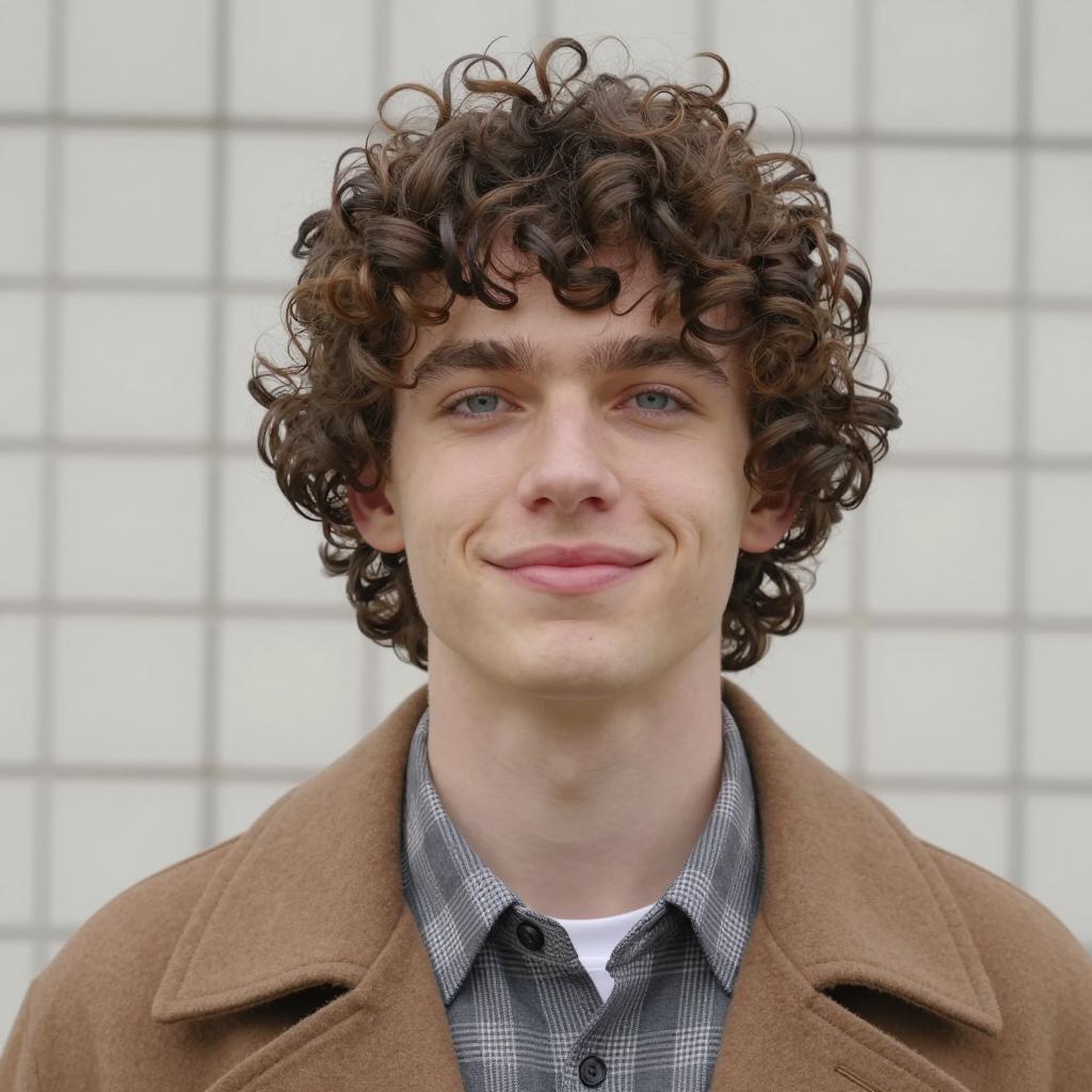 Man with curly brown hair, light skin, wearing a gray suit, brown tie, and beige vest, sitting on ground, smiling. Background: brick wall, rusty metal door, scattered debris, another man sitting in background. Overcast lighting.