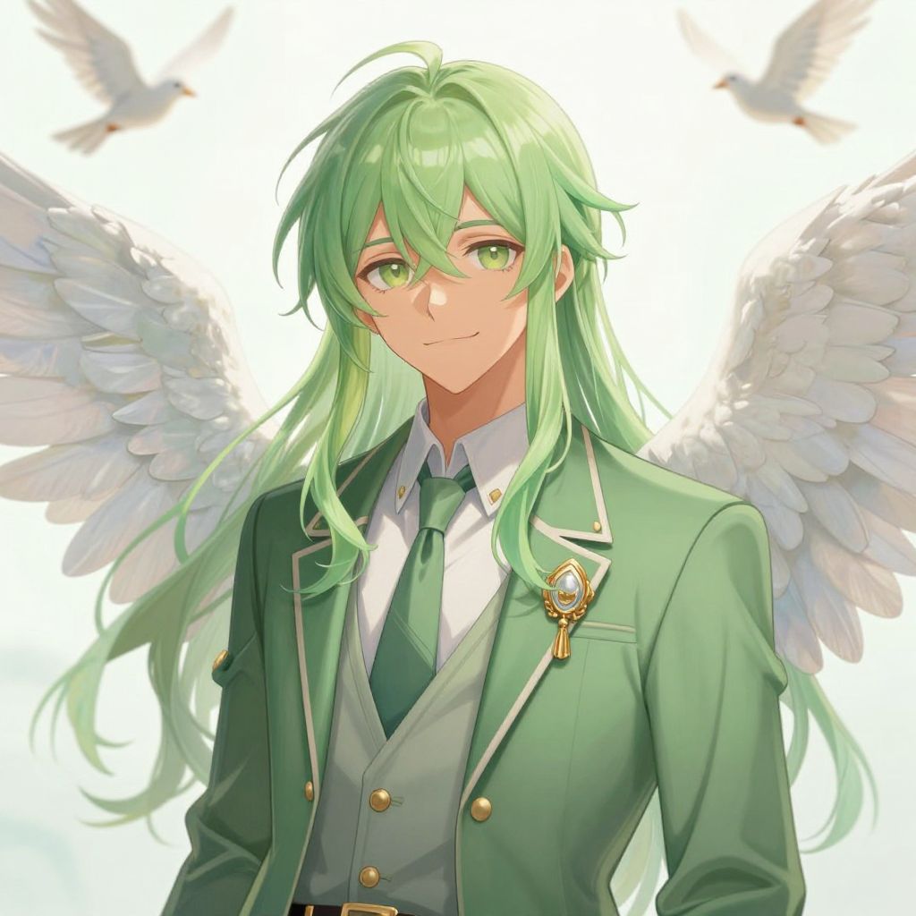 The image depicts an anime-style angelic young man with long, slightly wavy light green hair. His skin is tanned, and he has a sweetie face. He is wearing elegant clothes, including a green suit jacket with a gold brooch and a white shirt with a gray tie. The angel has white wings with delicate feather details, and there are small white birds flying in the background. The overall scene is bathed in soft, ethereal light, creating a serene and mystical atmosphere. The composition is balanced, with the angel positioned centrally, and the background elements adding depth and context to the scene.