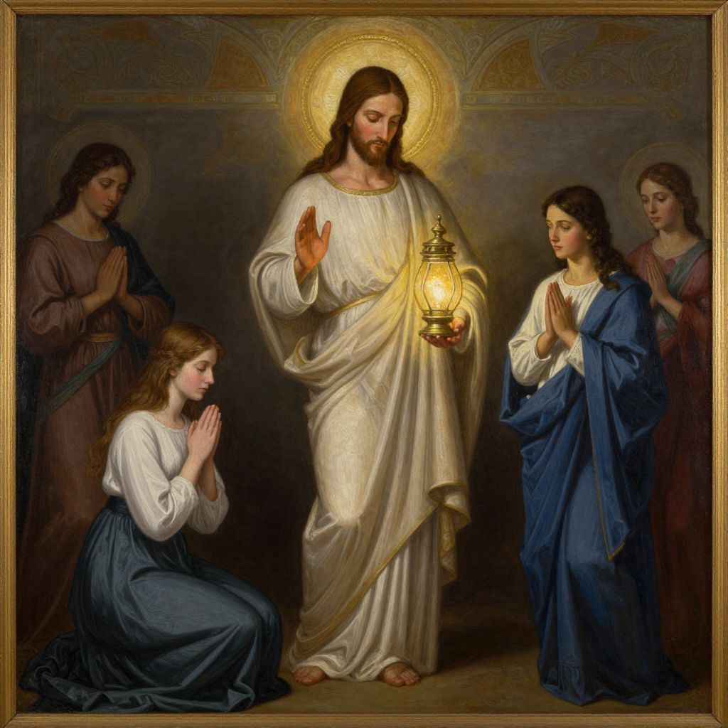 LDS art painting of Christ holding a lamp and leading a praying young woman.