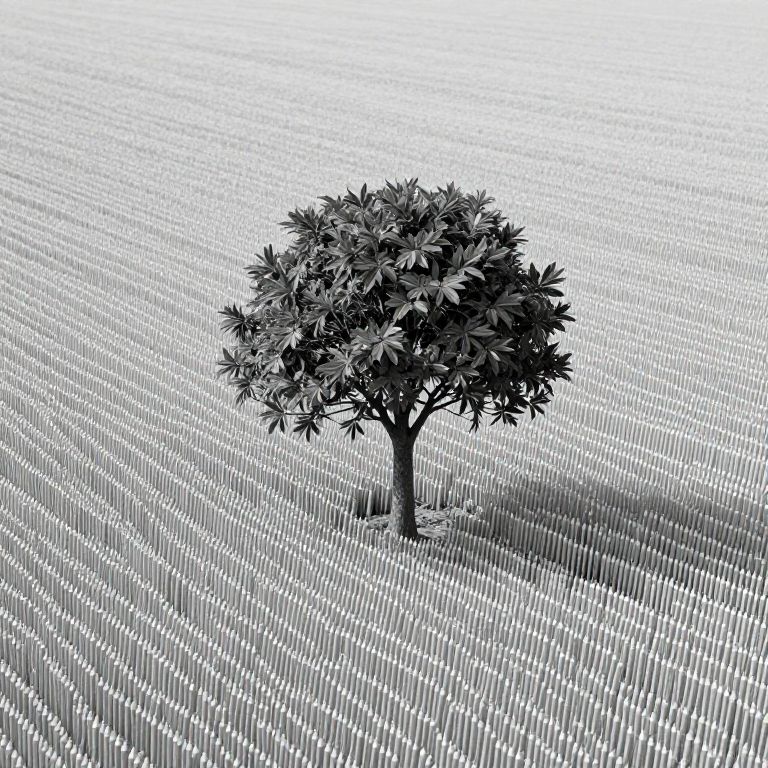 Amidst a sea of uniformity, a solitary tree stands as a beacon of individuality, its leaves whispering defiance against the structured, monochromatic field of pencils below, where creativity is confined yet yearns for freedom.