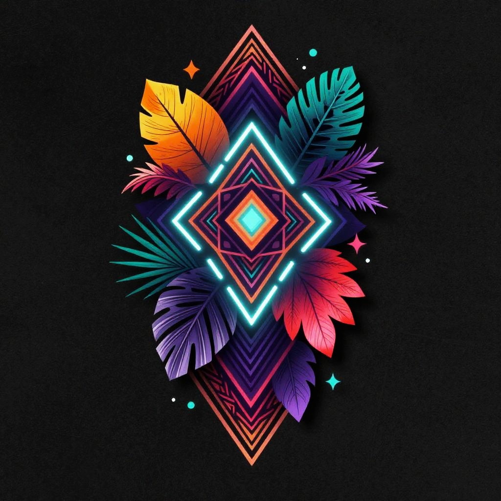 This digital artwork features a vibrant, neon-colored symmetrical design on a black background. At the center, a glowing blue diamond is surrounded by nested, glowing neon triangles in orange, pink, and blue. Surrounding the geometric shapes are vividly colored, stylized leaves in orange, yellow, red, purple, and blue, with detailed feather-like textures. Small, sparkling stars in blue and pink add a touch of whimsy. The overall style is reminiscent of retro-futuristic or cyberpunk aesthetics, with bright, contrasting colors and sharp, geometric shapes creating a dynamic and visually striking image.