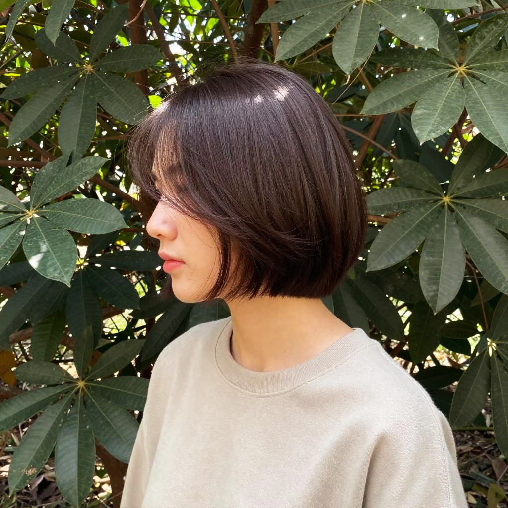 Guy bob haircut, young man standing in a lush garden with a smooth bob haircut, natural sunlight filtering through leaves, earthy tones and casual wear, peaceful and relaxed ambiance, fine details on hair strands