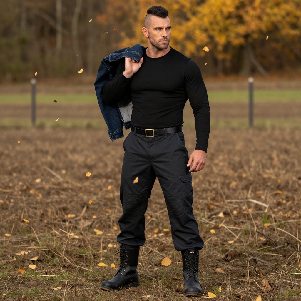 A highly detailed photo of a strong, athletic man with rugged facial features, a high forehead, and a sharp jawline, dressed in a black Blundstone outfit as a costume, standing in a rustic countryside field during autumn, golden leaves swirling around him, the boots slightly muddy from the ground, the outfit complete with black Blundstone boots, dark trousers, and a navy-blue denim jacket slung over his shoulder, dramatic natural lighting emphasizing his silhouette