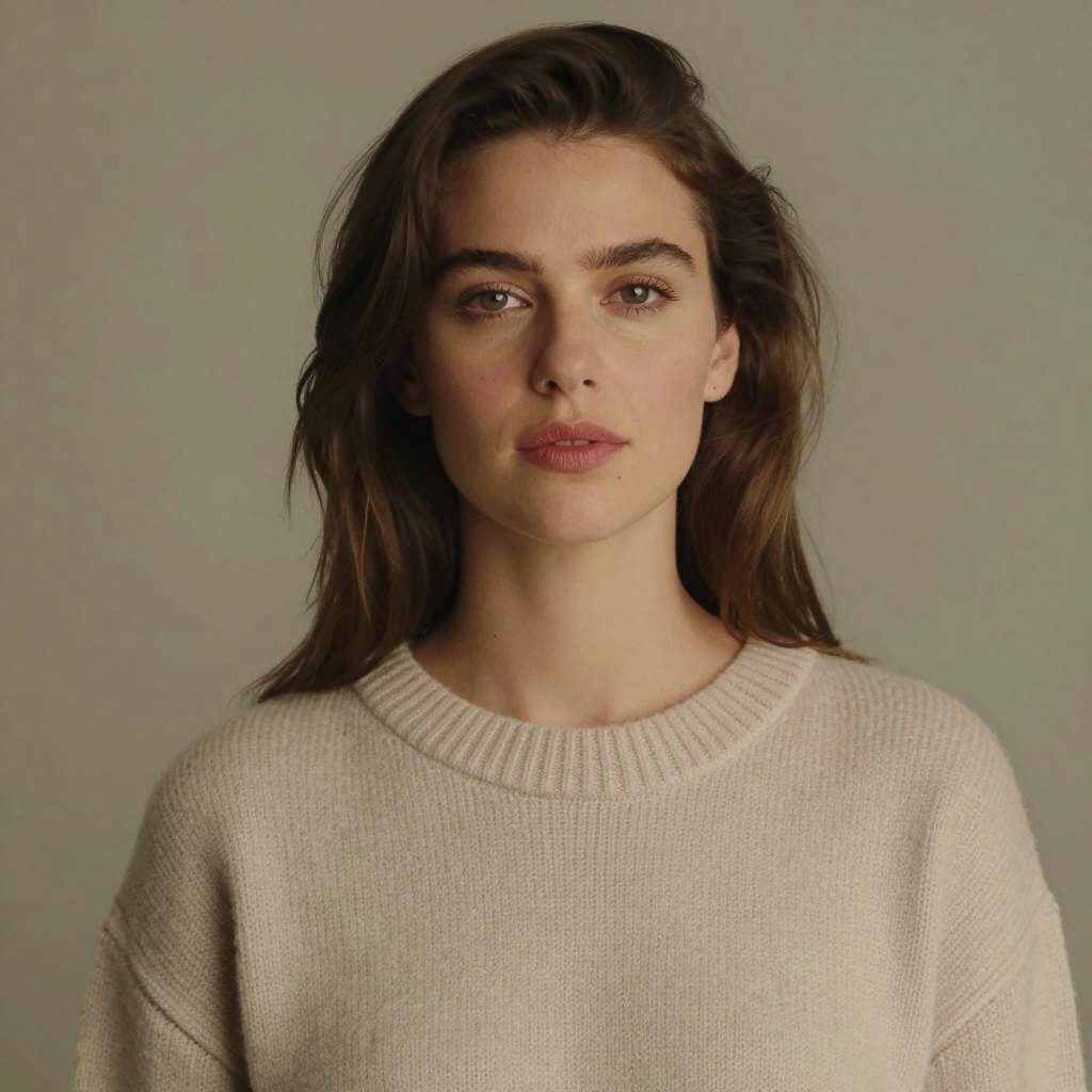 Portrait of a young Caucasian woman with natural makeup and simple loose hairstyle, wearing a beige knit sweater. The image showcases a relaxed and artistic vibe with soft lighting and neutral background.