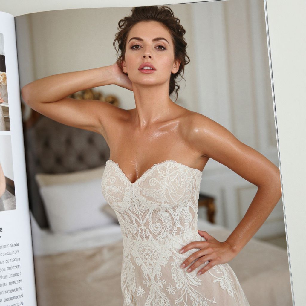 The image features a portrait of a woman, likely Vicki Odintcova, captured in a magazine spread photography style. She is depicted in a flirty, dynamic pose, looking up at the camera with a sense of engagement. The setting appears to be a bedroom or studio, with soft, natural lighting that highlights her radiant, shiny tanned skin covered in oil. She is wearing a feminine lace wedding dress, which adds a touch of elegance and sophistication to the composition. The dress is detailed with intricate patterns and textures, complementing her overall appearance. The photograph is taken with a 50mm lens, giving it a wide perspective that captures the full essence of the scene. The overall composition is balanced, with the woman positioned centrally, drawing the viewer's attention to her and the details of her attire. The background is softly blurred, ensuring that the focus remains on the subject and her attire. The image exudes a sense of bridal couture photography, with a focus on the intricate details of the dress and the woman's poised, confident demeanor.