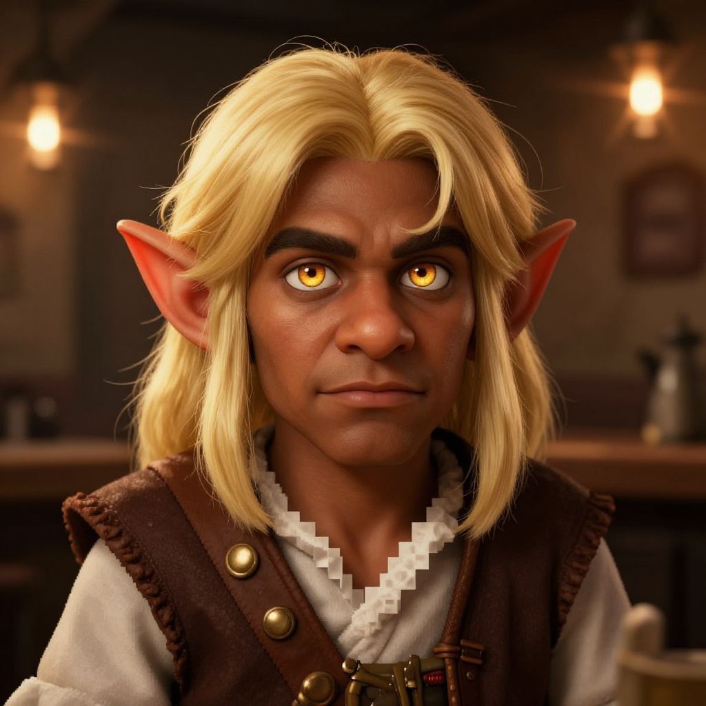(4k hi res, Hyper realistic), digital art portrait of a blonde haired dark skinned gnome man with amber eyes in a medieval tavern, lens flare, pixel art, piratical beauty