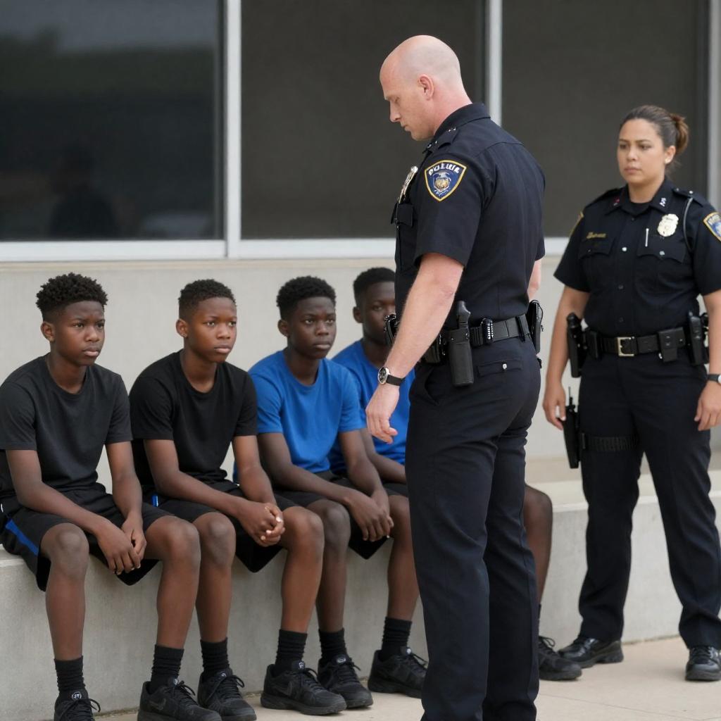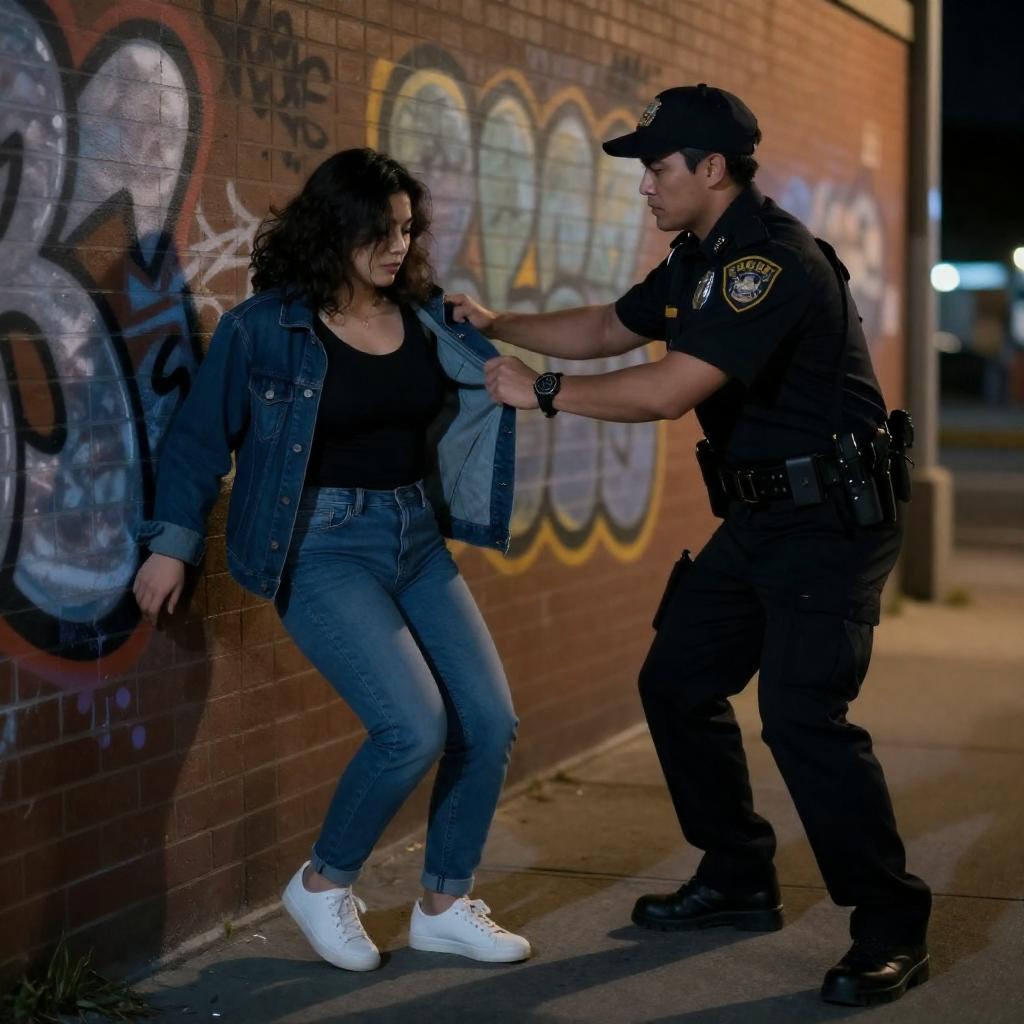 Photograph of a nighttime street scene. A person with short, blonde hair in a black shirt is in the foreground, back to the camera. In the background, two police officers in uniforms are interacting with a person with light brown hair, who is creating glowing green light trails with their hands. The light trails are swirling and bright. The scene is dimly lit, with a building door and column partially visible. The police officers have intense expressions.
