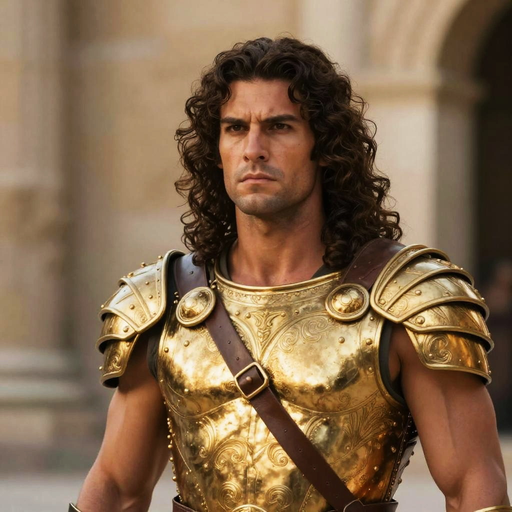 Photograph of a Middle Eastern man with medium brown skin and black wavy hair, wearing an ornate gold and turquoise crown, matching necklace, and detailed black and gold robe with intricate gold embroidery. He has a serious expression and wears dangling gold earrings. The background features ancient stone pillars in a desert setting, with a clear blue sky. The man's attire and accessories suggest a historical or royal significance, and the sunlight casts warm, golden hues over the scene.