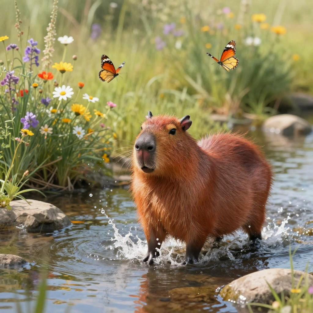 Flying capybara soaring gracefully through a vibrant sunset sky, surrounded by fluffy clouds and glowing birds, with detailed fur textures and whimsical wings, high resolution fantasy art style, vibrant colors and dynamic lighting
