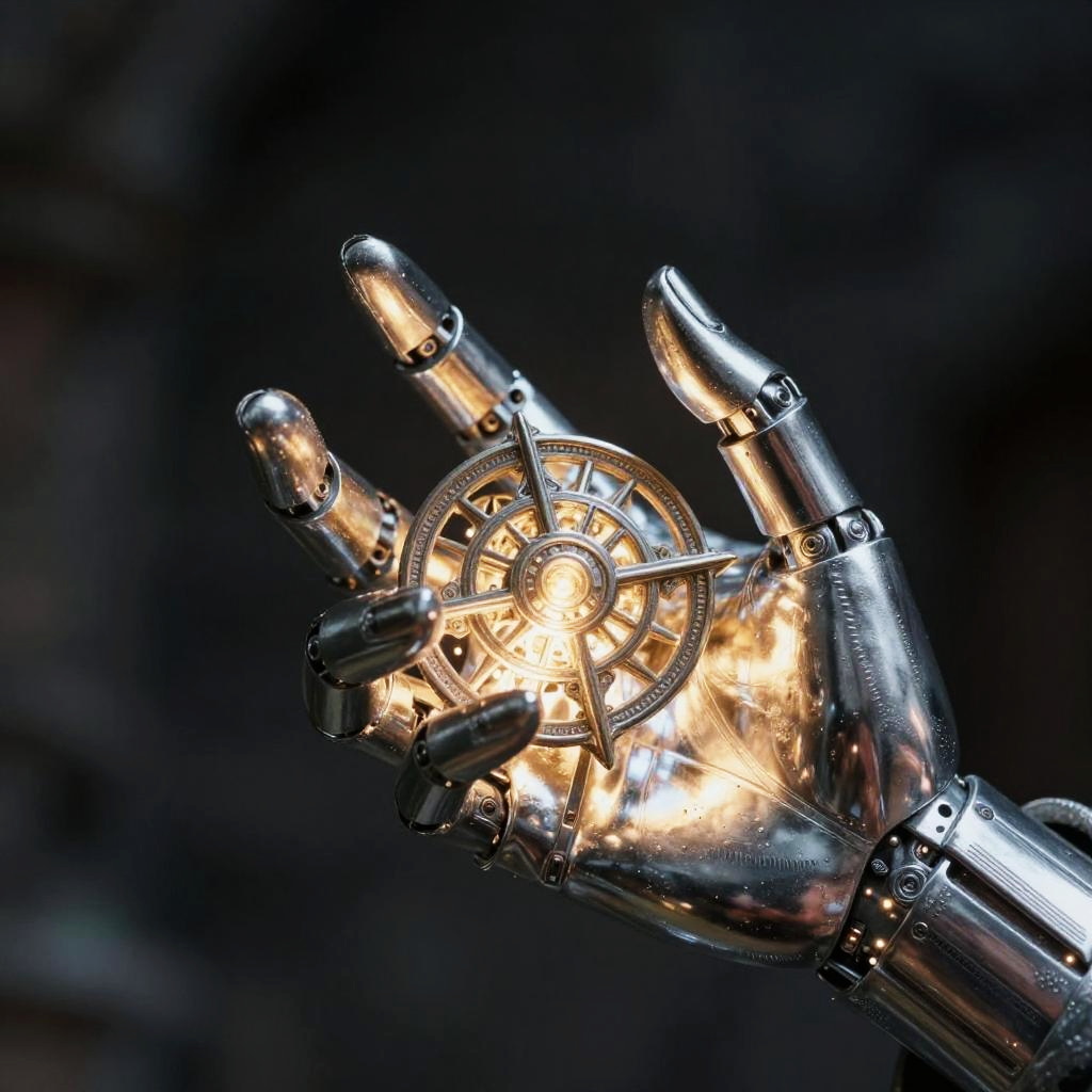 Close-up of silverhands gripping an ancient glowing artifact, mechanical fingers with sleek chrome plating and tiny LED indicators, contrasting with the mystical aura of the relic, blending fantasy and cyberpunk elements in a dramatic composition.