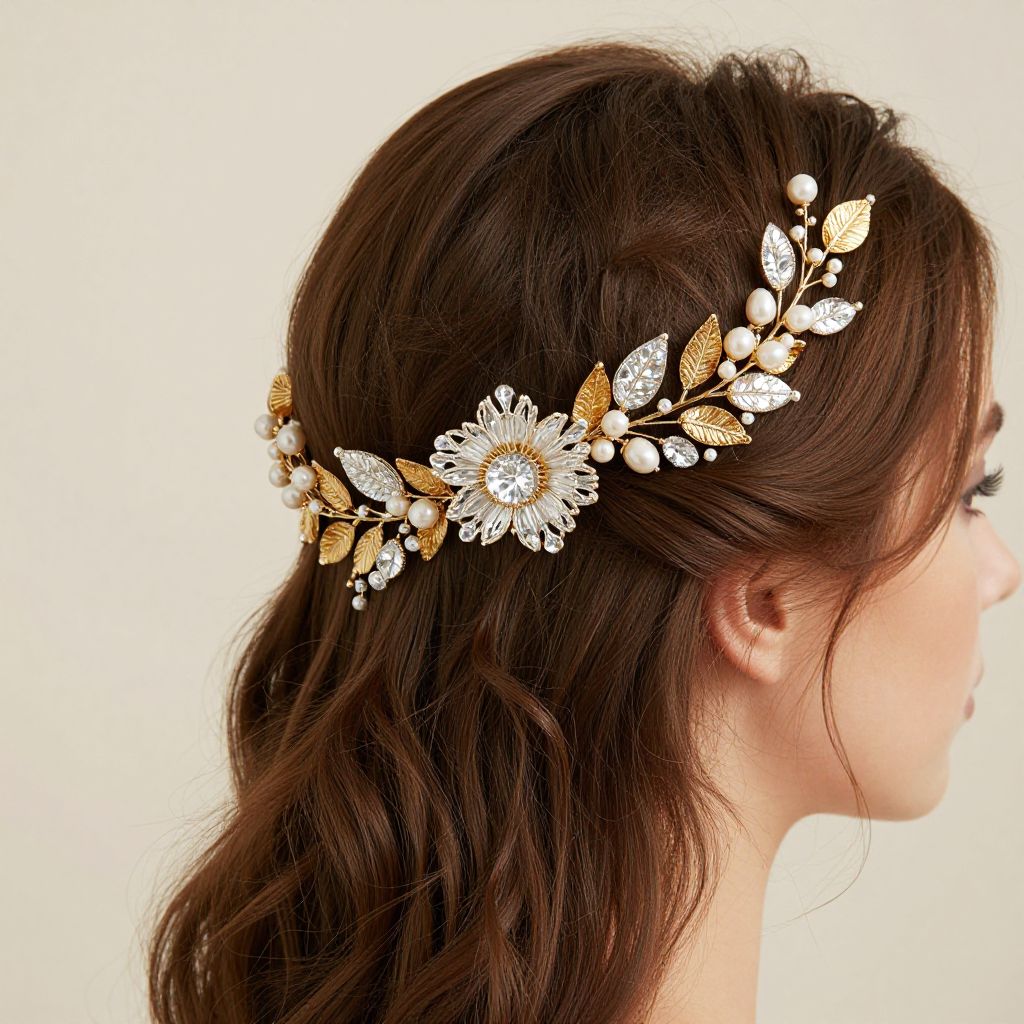 A woman with elegantly styled brown hair showcases a luxurious bridal headpiece featuring handmade gold leaf accents adorned with sparkling pearls and a central crystal flower, exuding timeless elegance and artisan craftsmanship.
