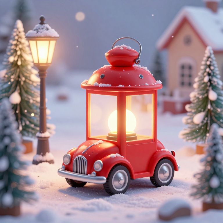 A whimsical 3D-rendered winter scene features a charming red toy car nestled inside a glowing lantern, surrounded by miniature dollhouse-style Christmas trees and a festive lightpole, all enveloped in a cozy, snow-covered ambiance with warm, bokeh lighting effects.