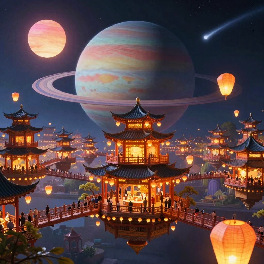 A stunning floating lantern bazaar city with a suspended paper-lantern bridges set against a orbiting a pastel gas giant, featuring a vibrant backdrop of twin pastel suns and a comet trail in the distance. This artwork is rich in detail, inspired by Mary Blair, showcasing cinematic lighting and hyperrealism, rendered in 8K.